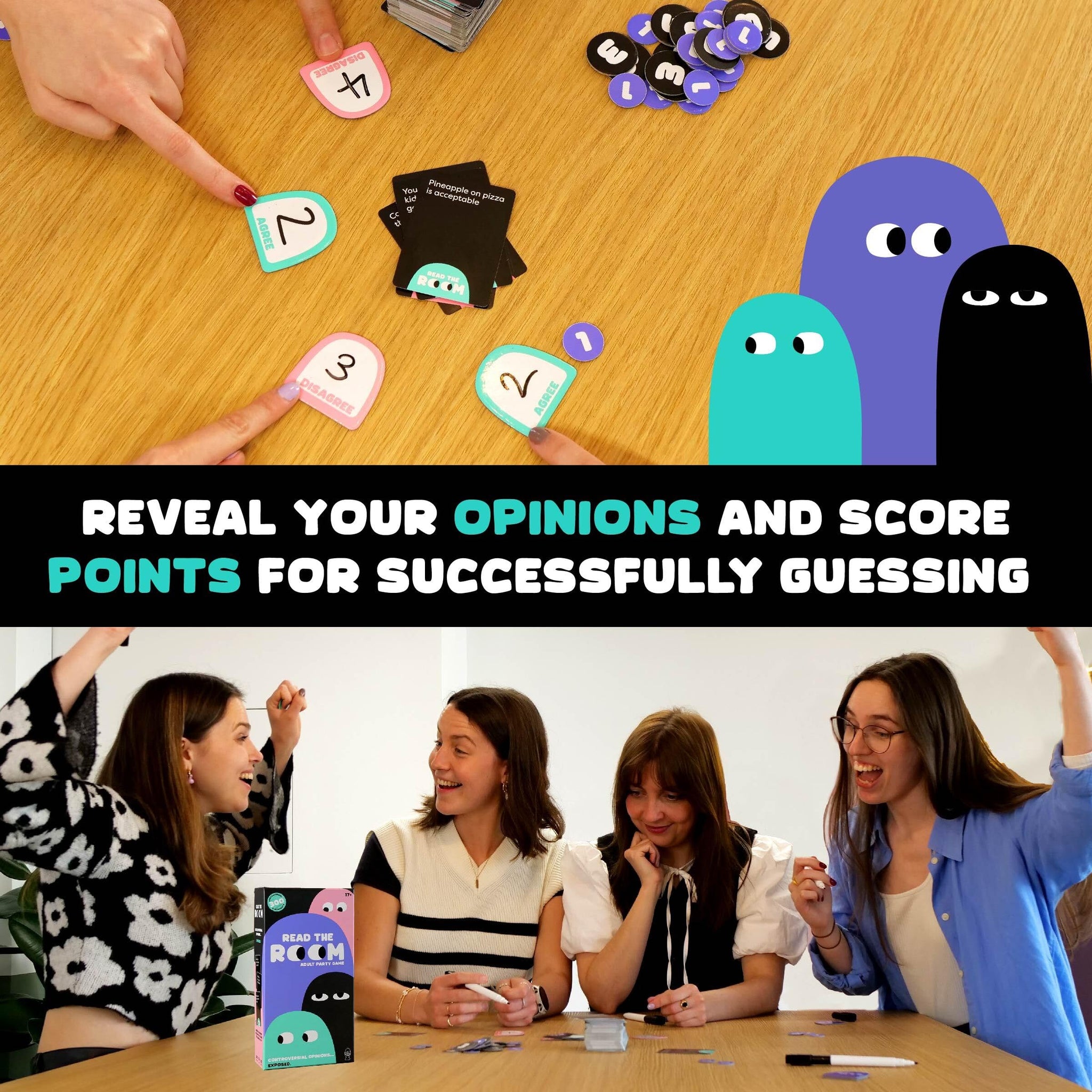 - Easy to Learn and Play: With straightforward rules, "Read the Room" is accessible to all adult players. Each game includes 16 agree/disagree tokens, 64 point tokens, and 8 pens, ensuring seamless play from start to finish. Whether you're a seasoned gamer or a newcomer, you'll find it easy to jump in and start having fun immediately.